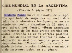 Rodolfo dunque, anche se deve procurarsi i mezzi di sostentamento che servono a lui e per la cura del padre malato, cerca il riscatto e lo trova nel duro lavoro del cinema muto. Il suo genio si manifesta anche in questo settore dove porta idee nuove e nuove modalità di rappresentazione. Compone infatti la musica per i film delle grandi produzioni cinematografiche dell’epoca (La Febbre dell’Oro di Chaplin, Messalina, Notre-Dame de Paris, etc), adattandola e sincronizzandola, facendola suonare da un corpo di 20 professori d’orchestra, appositamente fatti venire dal Colòn e che lui dirigeva. Incredibilmente cacciato dalle sale di concerto, trasforma in luogo di concerto le sale cinematografiche, dove convoglia spettatori-ascoltatori amanti della sua musica.